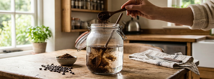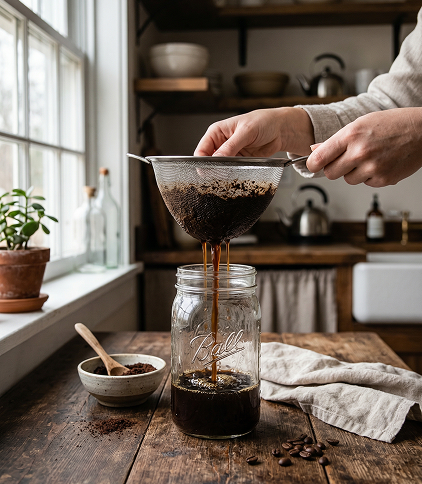 Cuela el café con un filtro fino o tela para retirar los residuos.