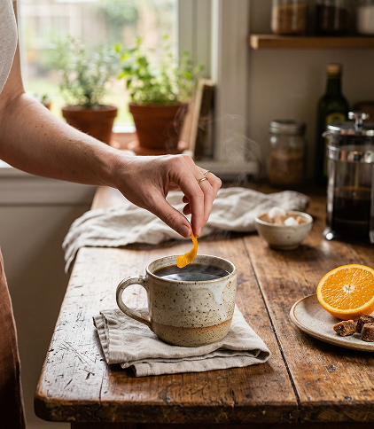 El café combina sorprendentemente bien con notas cítricas. La cáscara de naranja aporta un aroma fresco que equilibra el dulzor profundo de la panela y resalta algunas notas naturales del café.
